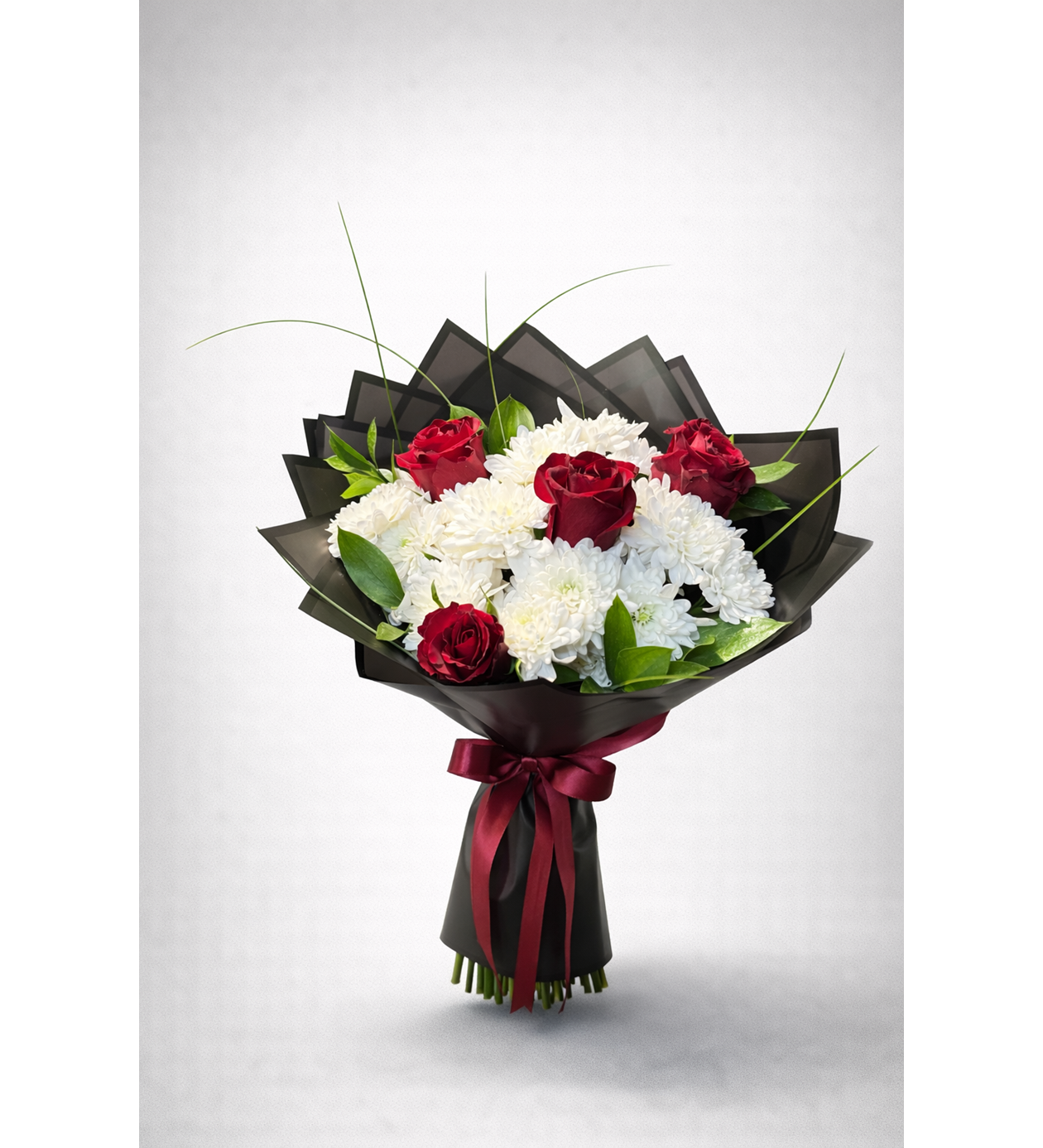 Beyaz chrysantem ve kırmızı gül buketi | Çiçek Pasaj