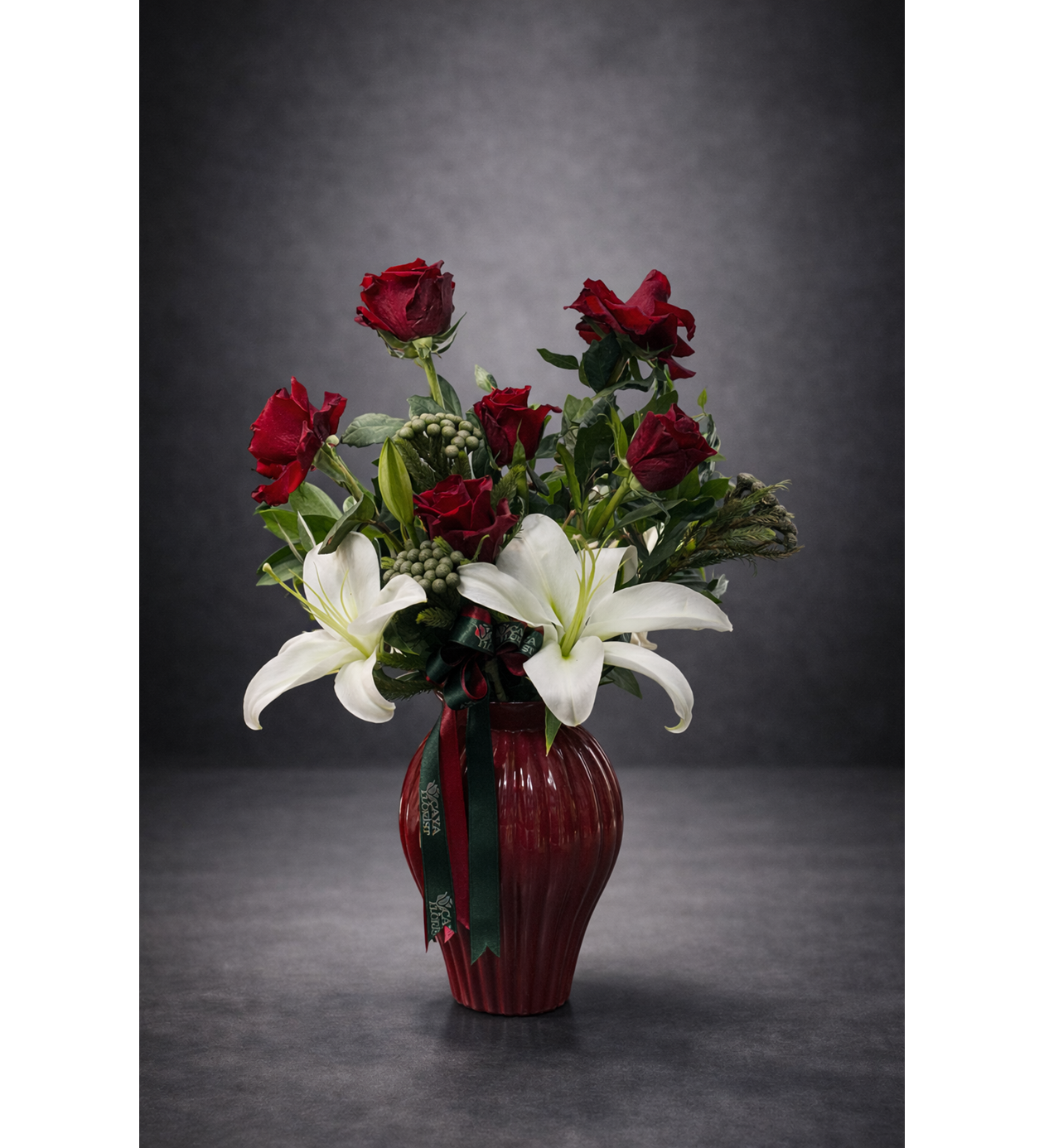 Tiny Vazoda kırmızı gül ve beyaz lilyum